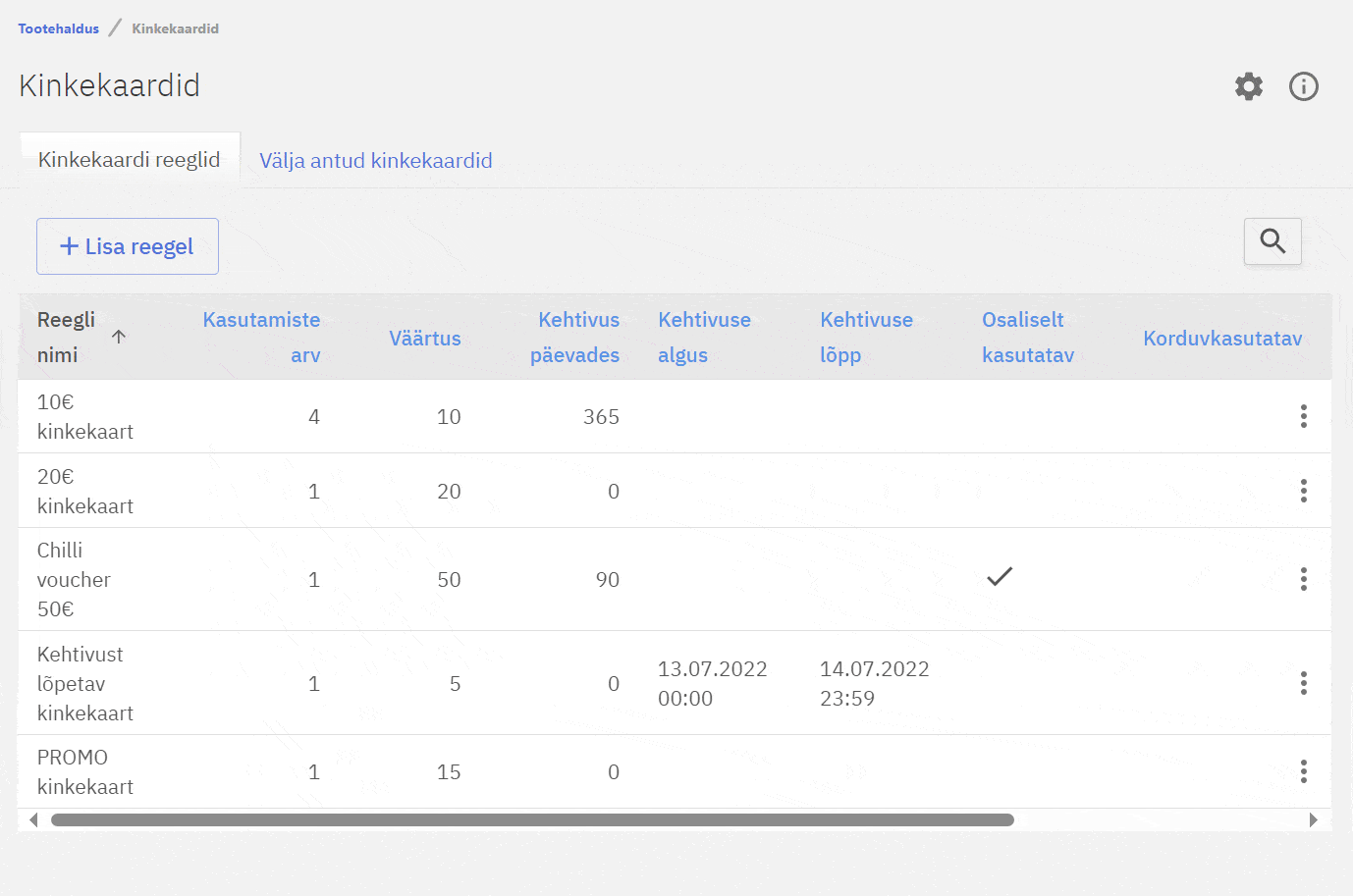 Reegliga kinkekaardi loomine eeldab tasulist keerukamate kinkekaartide moodulit ning ilma selle moodulita ei pruugi järgnevad valikud olla saadaval.