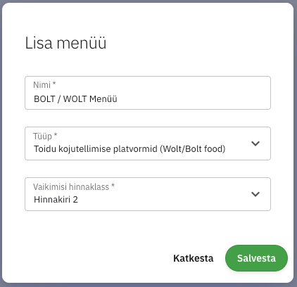 Menüüd saab lisada vajutades Lisa menüü nuppu paremal nurgas. Avanenud aknas tuleb anda nimi, ja valida tüüp. Hinnaklassiks tuleks valida hinnaklass, kus on märgitud Bolt / Wolt hinnad.