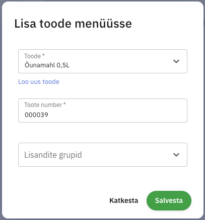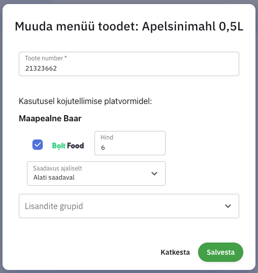 Toodet saab lisada valides rühma, kuhu see toode läheb, ning vajutades nuppu Lisa toode menüüsse, avanenud aknas saab otsida olemasolevat või luua uus toode. Lisaks saab tootele lisada ka lisandigrupi, mis antud tootele Bolt/Wolt keskkonnas lisanduma peaks.