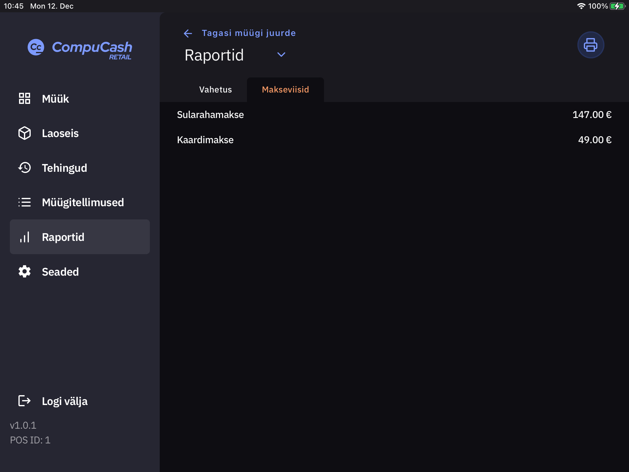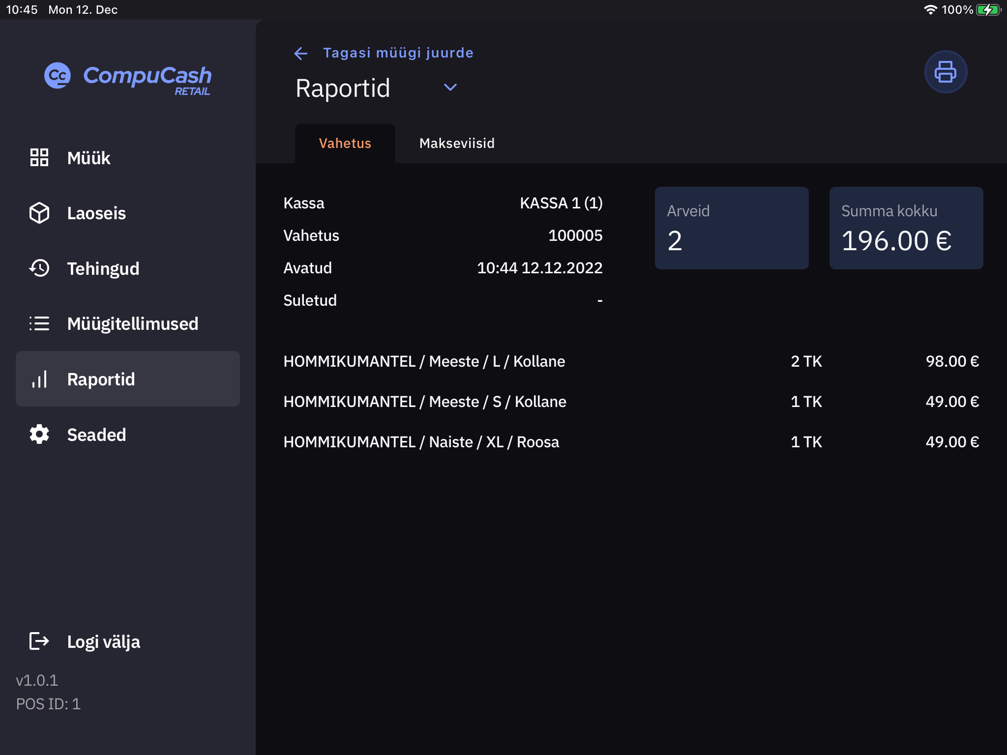 Raportite all on võimalik näha käimasoleva vahetuse jooksul tehtud müüke (tehtud arveid, müük kokku, müüdud tooted, müük maksevahendite lõikes). Võimalik on ka raport kviitungiprinterist välja printida.