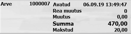 Kui vajutada Sulaha ja siis OK, sulgub arve kohe ja kogu summa registreeritakse sularaha alla. Soovitav on kirjutada kliendi poolt antud summa, siis programm annab teada kui palju peab raha tagasi andma.