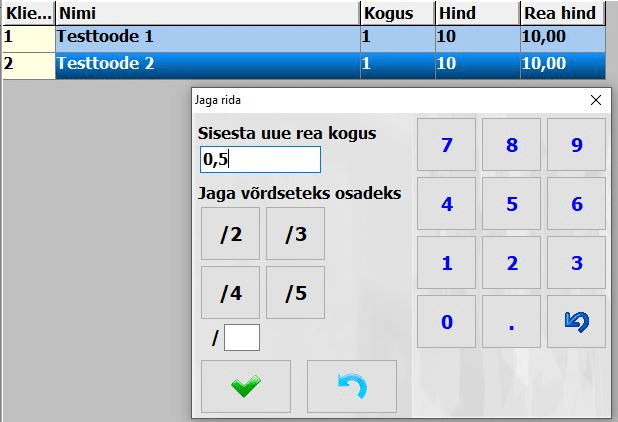 Kui on vaja arverida jagada, saab seda teha jagamismärgiga (/). Avaneb hüpikaken, kus saab valida mitmeks võrdseks osaks me valitud rea jagame, nt pudel vahuveini 3-le inimesele.