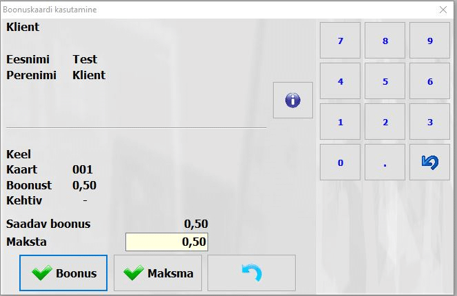 Boonuskaardi kasutamisel avaneb võimalus koguda boonust „Boonus“ või maksta „Maksma“ juba kogutud boonusega. Seadistuses on vaja lubada osaline boonuskaardiga maksmine.