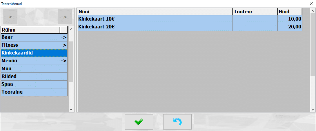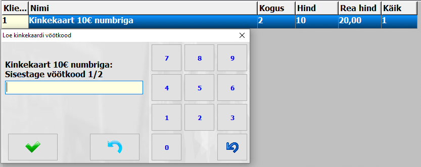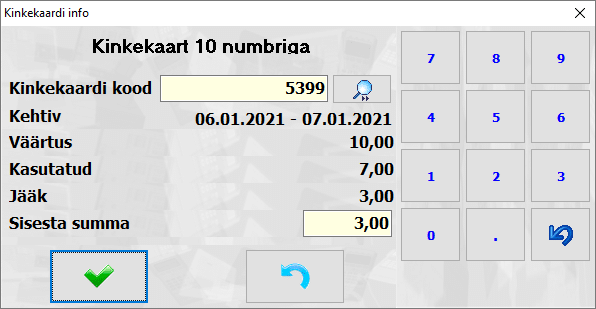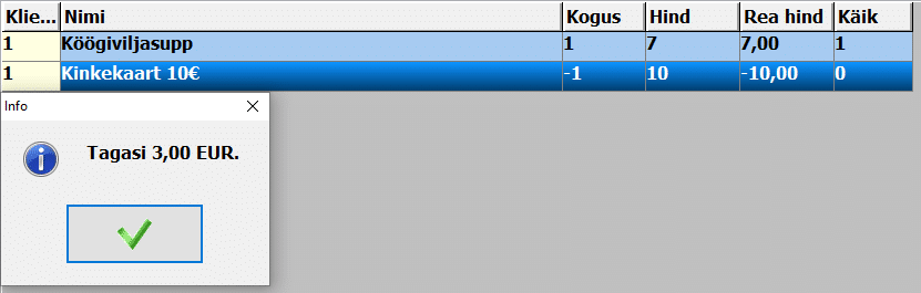 - Kinkekaardid on seadistatud selliselt, et kinkekaardiga ülemakstud summa tagastatakse kliendile – sularaha makse registreerimisel palub programm kliendile ülemakstud osa tagasi maksta. Kassast toimub selle summa ulatusest sularaha väljamakse.