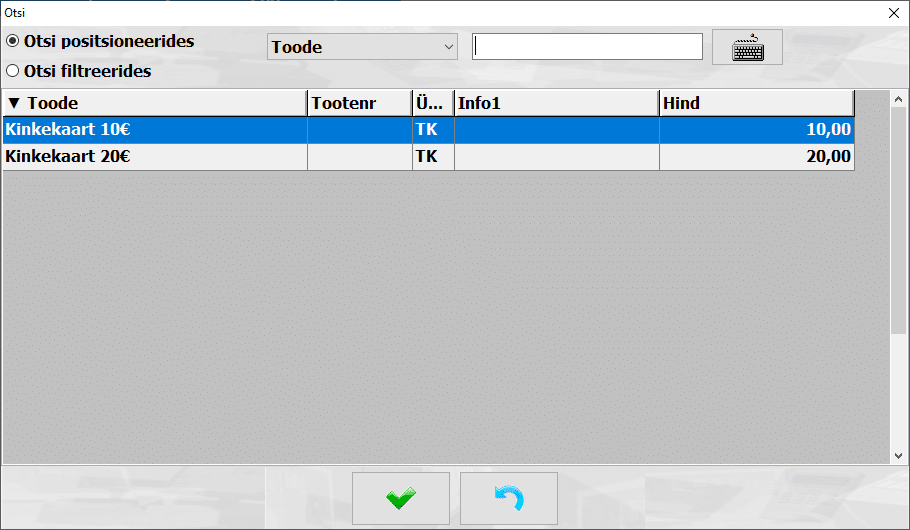 Uue tooterea lisamine tootenime järgi – Kiirvaliku paneelilt (kui vastav valik on paneelile lisatud), tavaklaviatuurilt SHIFT+F5 või menüüst Toode > Otsi toode nime järgi