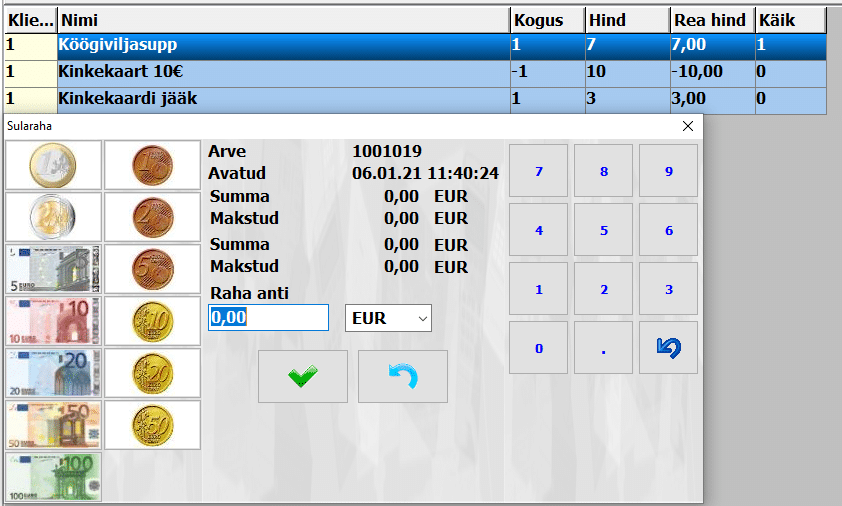 - Kinkekaardid on seadistatud selliselt, et kinkekaardiga ülemakstud summa puhul raha ei tagastata – sularaha makse valimisel lisatakse arvele kinkekaardi jäägi toode kinkekaardiga ülemakstud summa ulatuses, et arve lõppsumma oleks 0. Arve saab lõpetada 0€ sularaha maksega.