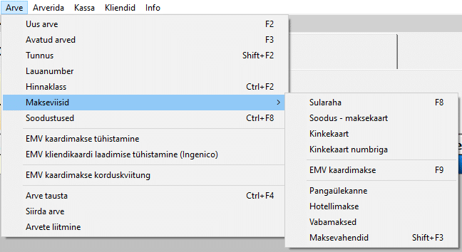 Süsteemis on võimalik kasutada erinevaid makseviise. On palju juba süsteemi poolt defineeritud makseviise aga valikusse saab lisada ka uusi makseviise (vabamaksed). Vaikimisi on aktiveeritud Sularaha ja Kliendikaart (Soodus- maksekaart), ülejäänud makseviisid tuleb häälestusega määrata, mittevajalikud makseviisid on soovitav selguse mõttes välja jätta.