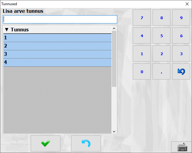Tunnus – saab määrata arve tunnust hilisemaks identifitseerimiseks. Soovitav on enamkasutatavad tunnused kontoris valmis teha, siis on neid lihtne kassas valida (nt laudade numbrid või nimed „laud1“ või „terrassilaud 1“). Alati saab ka tunnuse ise vabas vormis kirjutada. Tunnus kuvatakse tellimuskviitungitel (köök, baar) ning avatud arvete aknas, et oleks võimalik arveid eristada.