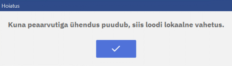 Katkestuse likvideerimise järel kaob hoiatus. Samuti ühendatakse automaatselt lokaalses vahetuses tehtud avatud arved peaarvuti omadega ja sünkroniseeritakse vahapealsed tehingud.
