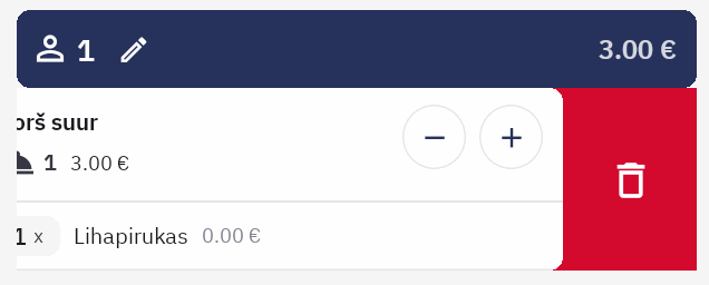 Kustutamine – kustutamiseks tuleb arverida näpuga vasakule lohistada, seejärjel ilmub arverea lõpus nähtavale kustutusnupp, millele vajutades rida kustutatakse.