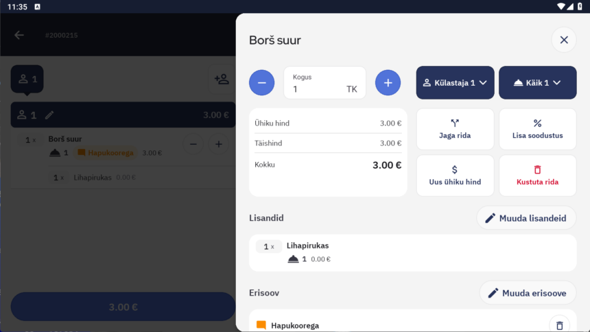 Jaga rida – võimaldab arverida jagada mitme külastaja vahel (nt 1 suur pitsa jagatakse kahe inimese vahel