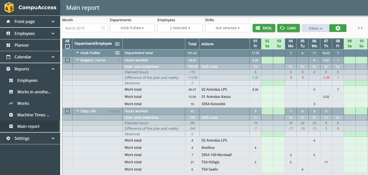 - Из сводного рапорта можно получить информацию о работах, отсутствиях на работе и сверхурочных часах.