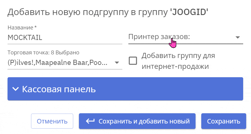 Сначала необходимо назвать группу, группы должны быть названы так, чтобы ни у двух групп товаров не было одинаковых названий. Во-вторых, можно выбрать принтеры заказов, все товары в текущей группе будут печатать свои квитанции на выбранных принтерах. Фильтр точки продаж позволяет ограничить продажу товаров под группой товаров по точке продаж.