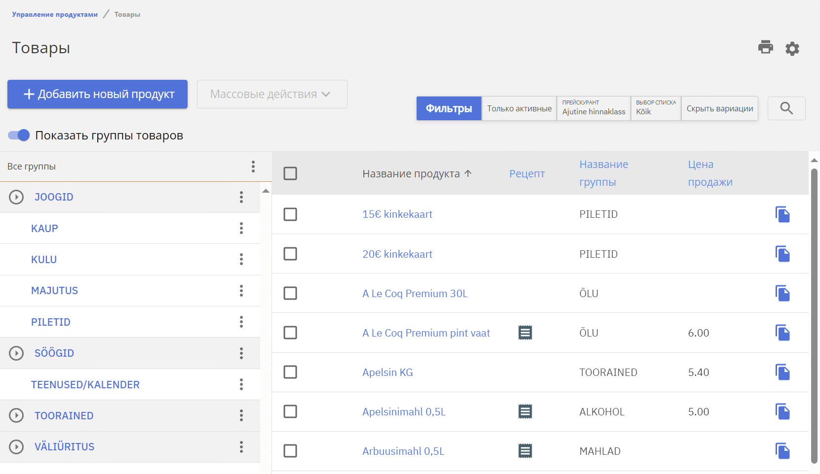 Список товаров отображает все текущие активные товары, поиск и фильтры расположены справа. Фильтры позволяют фильтровать перечисленные товары по определенным параметрам. Активные фильтры отображаются справа.