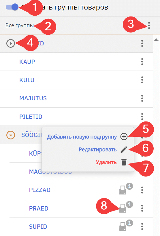 Новые основные группы можно добавить, нажав три точки справа от всех групп и выбрав Добавить основную группу. Подгруппы для существующих групп товаров можно добавить, нажав три точки после выбранной группы товаров и выбрав Добавить новую подгруппу.
