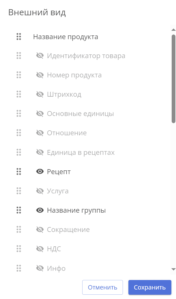 Нажатие на глаз скрывает столбец, порядок можно изменить, перетаскивая 6 точек.