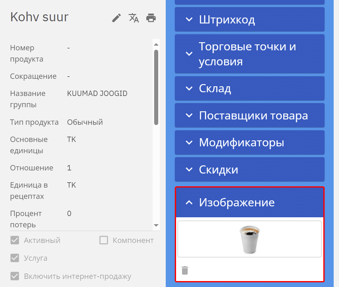 Изображения можно добавить к продуктам для отображения в сети, перейдя в Карточку продукта и Изображение.