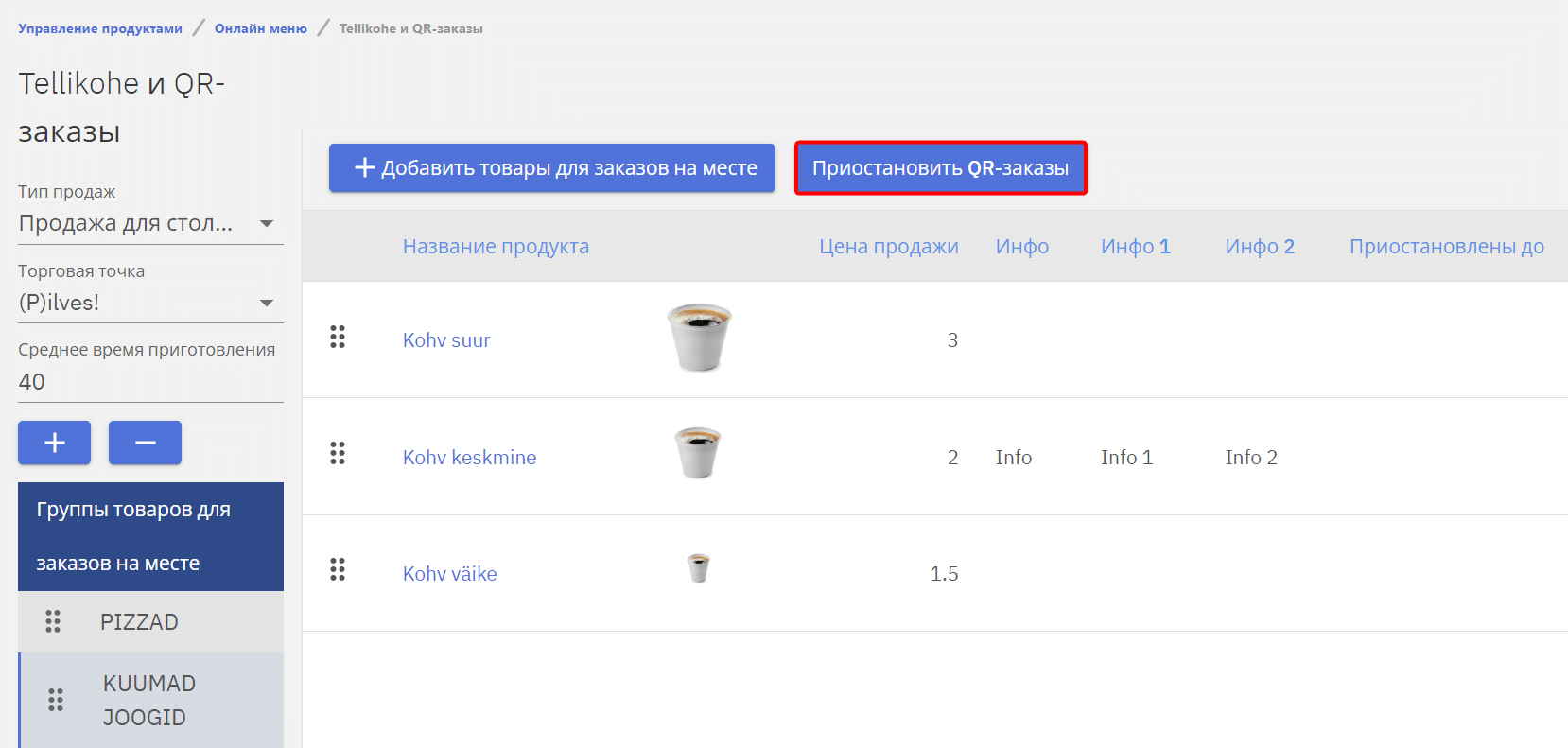 Настройки среды Tellikohe.ee можно выполнить, перейдя в Управление продукцией, Онлайн-меню и Tellikohe и QR-заказы.
