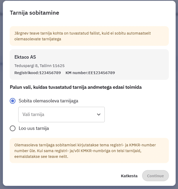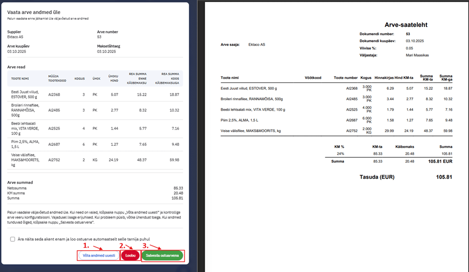 Siin aknas saab üle kontrollida tarnija arve ning imporditava arve vastavuse. Ebakõlade puhul (nt. summade mitte klappimine) teavitatakse sellest.
