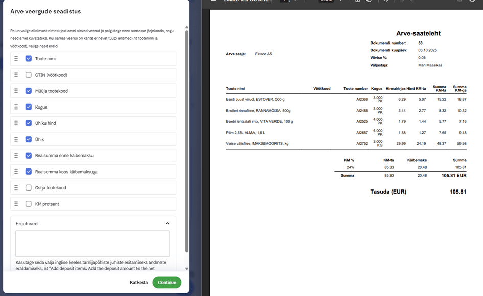 Esimesel korral tarnija arvet sisse võttes peab häälestama arve veergude seadistuse, et programm teaks, millised veerud, millist infot endas sisaldavad.