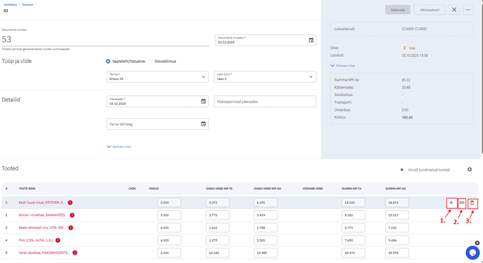 1 – Loo arve rea põhjal uus toode (juhul kui toodet CompuCashis olemas ei ole saab selle siit otse luua ja ka siduda tarnija tootega)