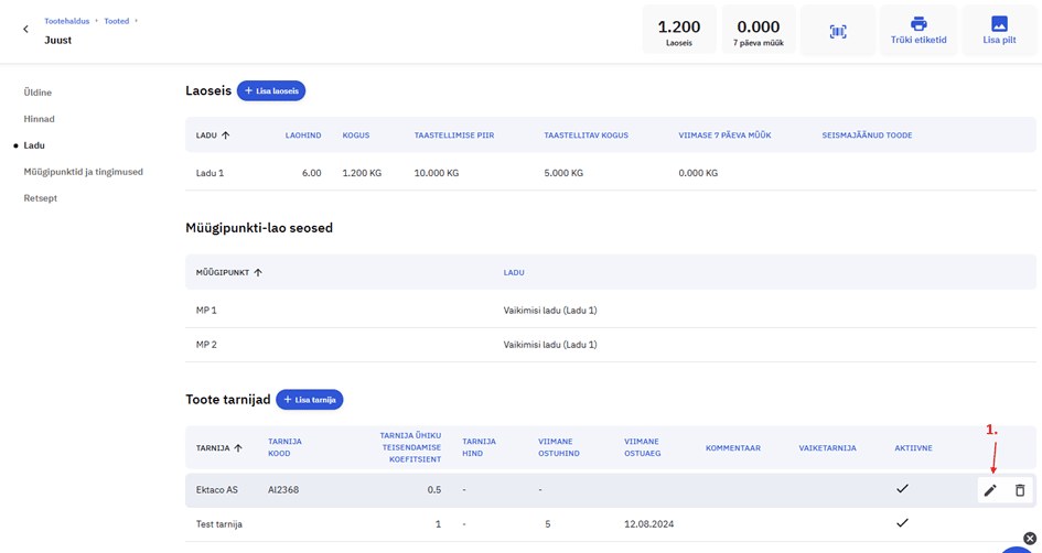 Seda seost saab näha ja muuta Tootehaldus>Tooted>Vajutades toote nime peale>Ladu>Toote Tarnijad