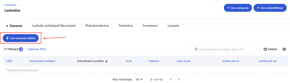 Esmalt veendu, et tarnija, kelle dokumenti hakkad sisestama, oleks süsteemi lisatud ja olemas Tarnijad tabelis.